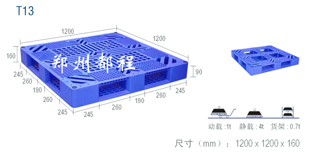 产品描述: 郑州都程塑料有限公司此款塑料托盘适合平地垫仓,在货架上或码垛使用;